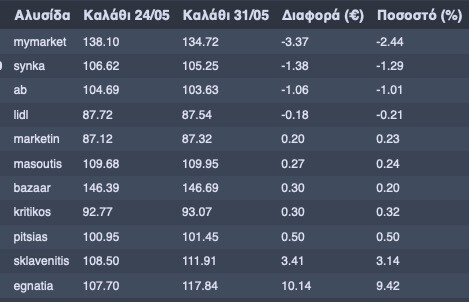 Αναλυτικά στον πίνακα που επισυνάπτεται το κόστος του «Καλαθιού του Νοικοκυριού» ανά σούπερ μάρκετ και η μεταβολή του από την 30η στην 31η εβδομάδα.