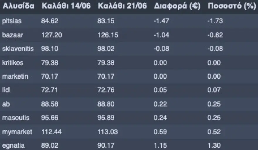 Στον πίνακα επισυνάπτεται το κόστος του «Καλαθιού του Νοικοκυριού» ανά σούπερ μάρκετ και η μεταβολή του από την 33η στην 34η εβδομάδα.
