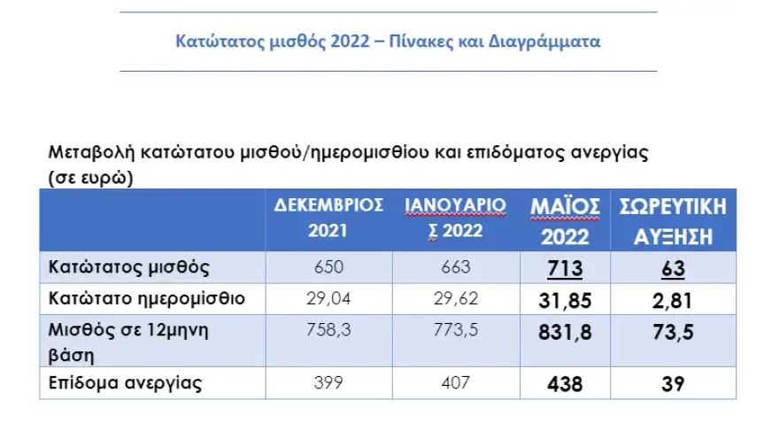 Αν συνυπολογισθεί και η προηγούμενη αύξηση του κατώτατου μισθού που έγινε την 1η Ιανουαρίου 2022, προκύπτει αύξηση κατά 9,7 %, ή 63 ευρώ το μήνα (από 650 ευρώ στα 713 ευρώ). Δεδομένου ότι καταβάλλονται 14 μισθοί, το όφελος από την διπλή αύξηση του κατώτατου μισθού το 2022 διαμορφώνεται στα 882 ευρώ ετησίως (63 ευρώ επί 14 μισθούς).