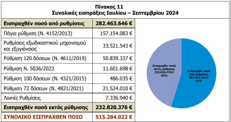 Ωστόσο, οι συνολικές εισπράξεις κατά το γ΄ τρίμηνο του 2024 ανήλθαν σε 515.284.022 ευρώ, με ποσοστό 55% να προέρχεται από πληρωμές οφειλών που έχουν ενταχθεί σε καθεστώς ρύθμισης και 45% από καταβολές εκτός ρύθμισης. Πρόκειται για το μεγαλύτερο ποσό εισπράξεων τριμήνου που έχει πραγματοποιηθεί από την έναρξη λειτουργίας του ΚΕΑΟ.