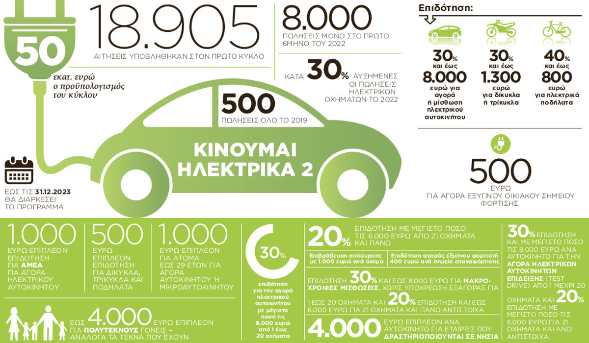 – Νέοι έως 29 ετών: Παρέχεται επιπλέον επιδότηση 1.000 ευρώ για την αγορά ηλεκτρικού αυτοκινήτου ή μικροαυτοκινήτου.