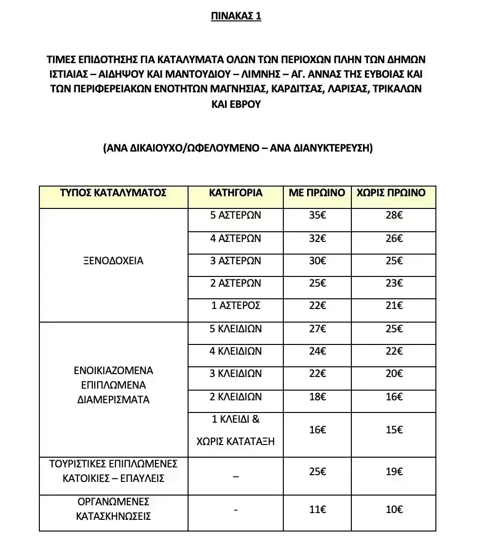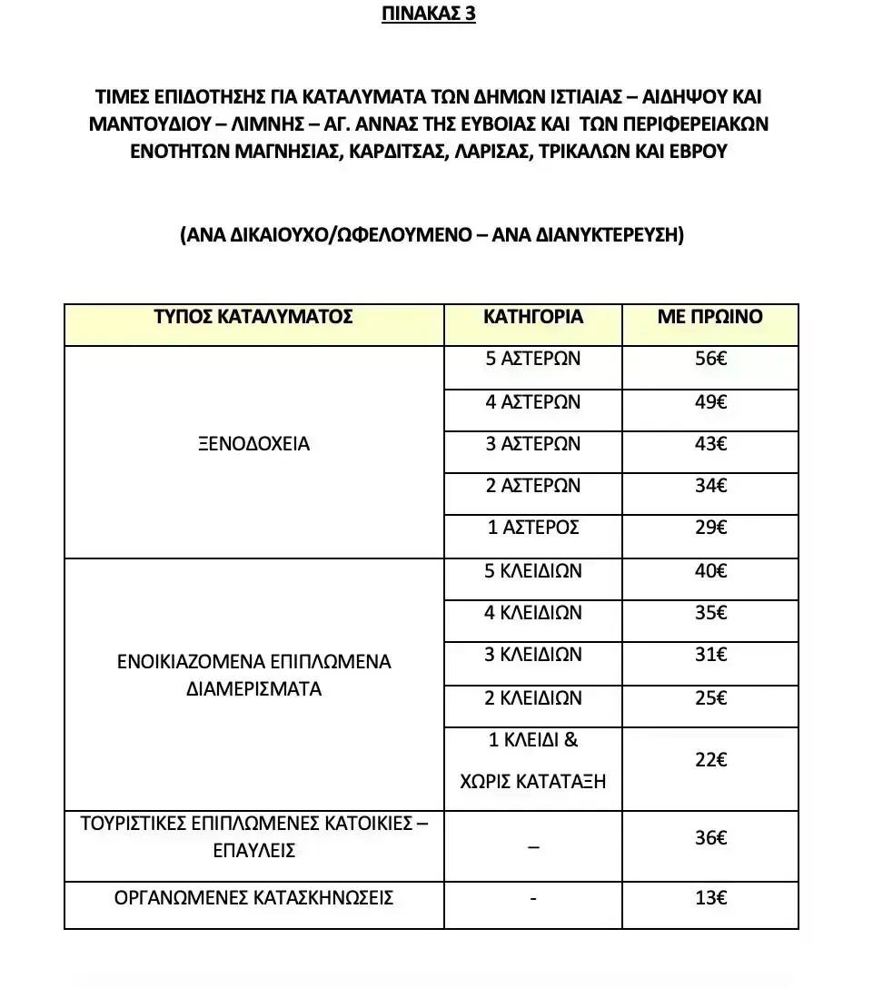 Οι τιμές επιδότησης παραμένουν αυξημένες κατά 20% για τον μήνα αιχμής Αύγουστο, με αντίστοιχη επιδότηση κατά 20% και για τις περιόδους των Χριστουγέννων (από 15/12/2024 έως 14/01/2025) και του Πάσχα (από 11/04/2025 έως 27/04/2025). Η αυξημένη επιδότηση ισχύει για όλο τον χρόνο για τα καταλύματα της Β. Εύβοιας, του Έβρου και της Θεσσαλίας, εκτός των Σποράδων.
