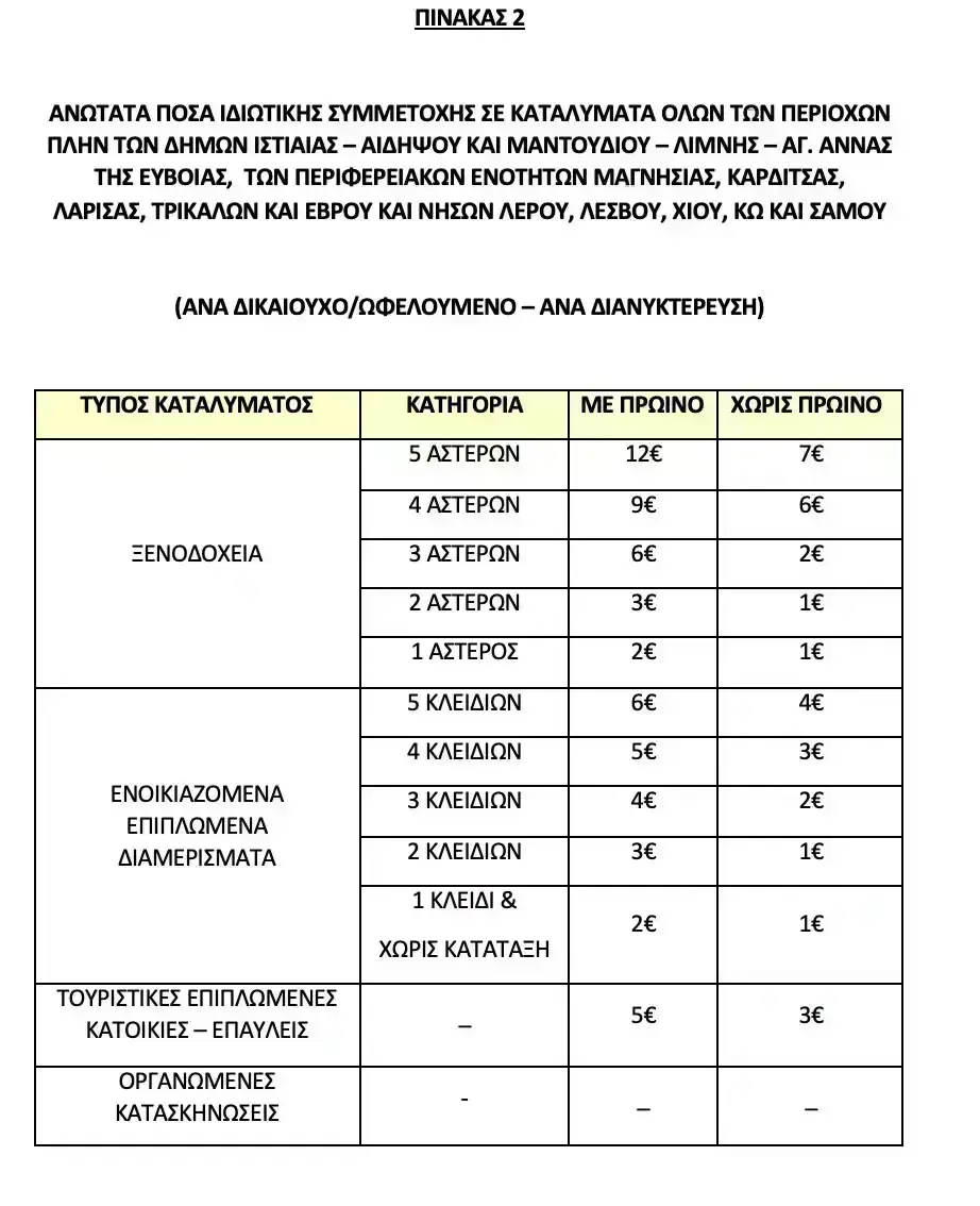 Ειδικά, σε Λέρο, Λέσβο, Χίο, Κω και Σάμο, μπορούν να πραγματοποιηθούν έως 10 διανυκτερεύσεις δωρεάν (μηδενική ιδιωτική συμμετοχή), ενώ στους δήμους Ιστιαίας-Αιδηψού και Μαντουδίου-Λίμνης-Αγ. Άννας της Β. Εύβοιας και του Έβρου, μπορούν να πραγματοποιηθούν έως 12 διανυκτερεύσεις δωρεάν, στο οποίο εφέτος προστίθεται η Θεσσαλία, εκτός των Σποράδων.