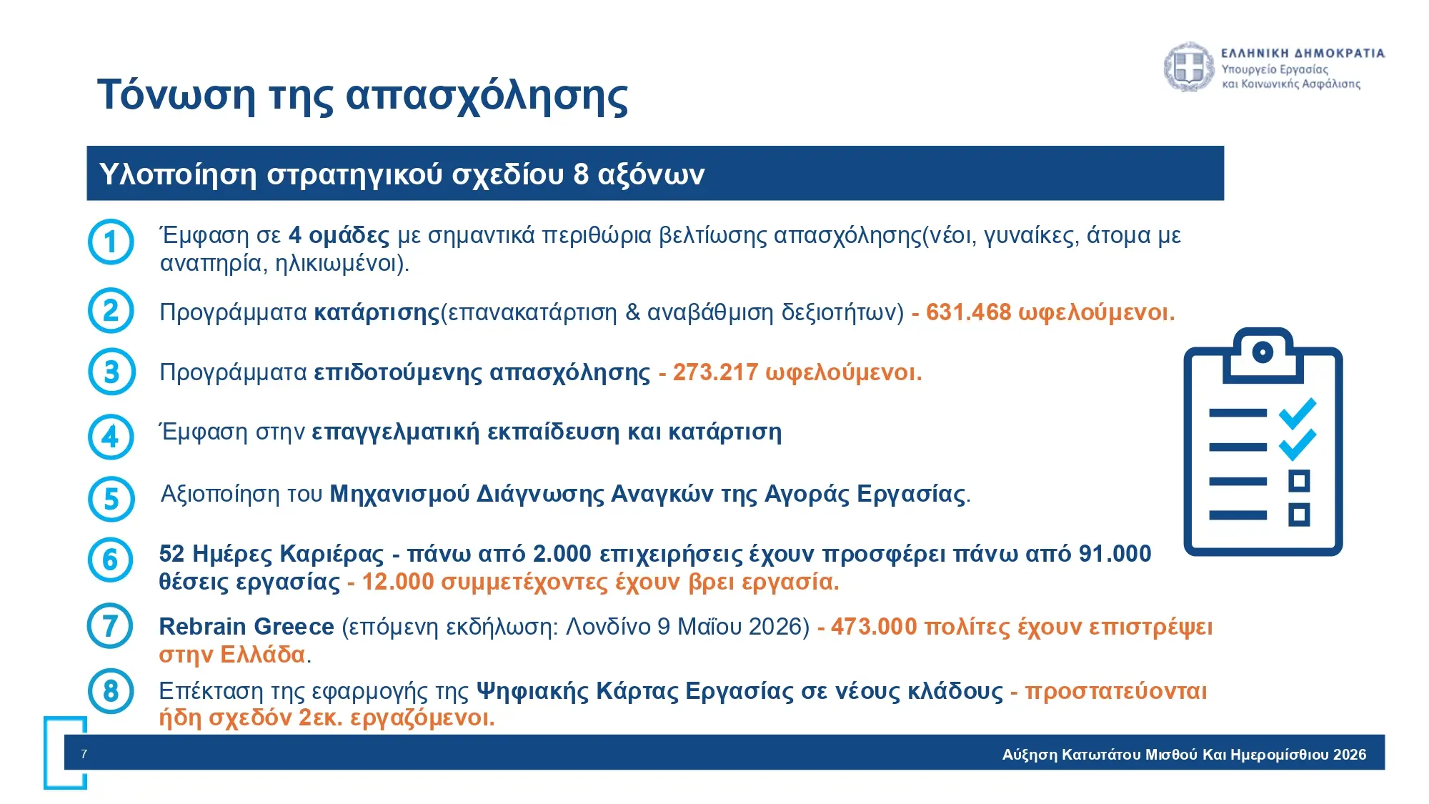 Η συνέντευξη Τύπου ξεκίνησε με την Νίκη Κεραμέως να παραθέτει στοιχεία για τη μείωση της ανεργίας, τις αυξήσεις των μισθών και την αύξηση της απασχόλησης των γυναικών. Στη συνέχεια η υπουργός Εργασίας τόνισε πως η ανεργία έχει μειωθεί στο 7,7% τον Ιανουάριο του 2026, από 17,8% τον Ιούλιο 2019, και βρίσκεται στο χαμηλότερο επίπεδο των τελευταίων 18 ετών.