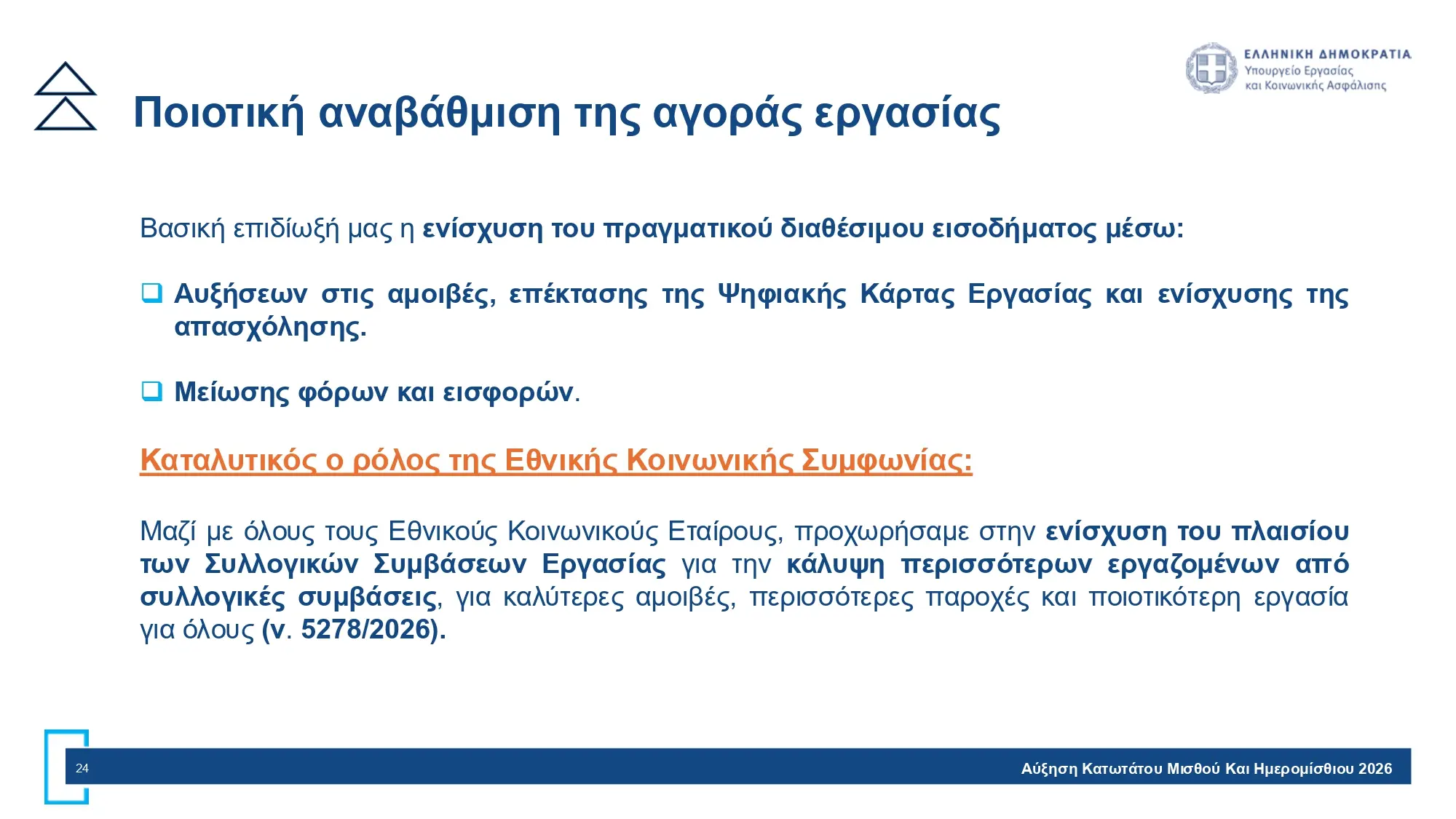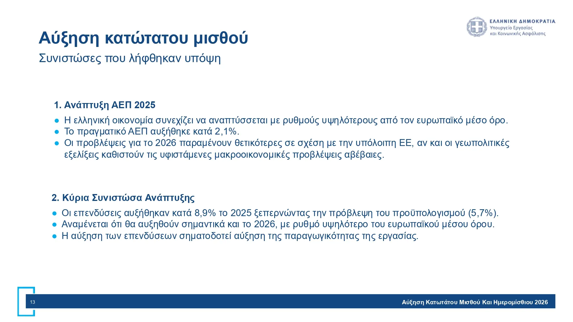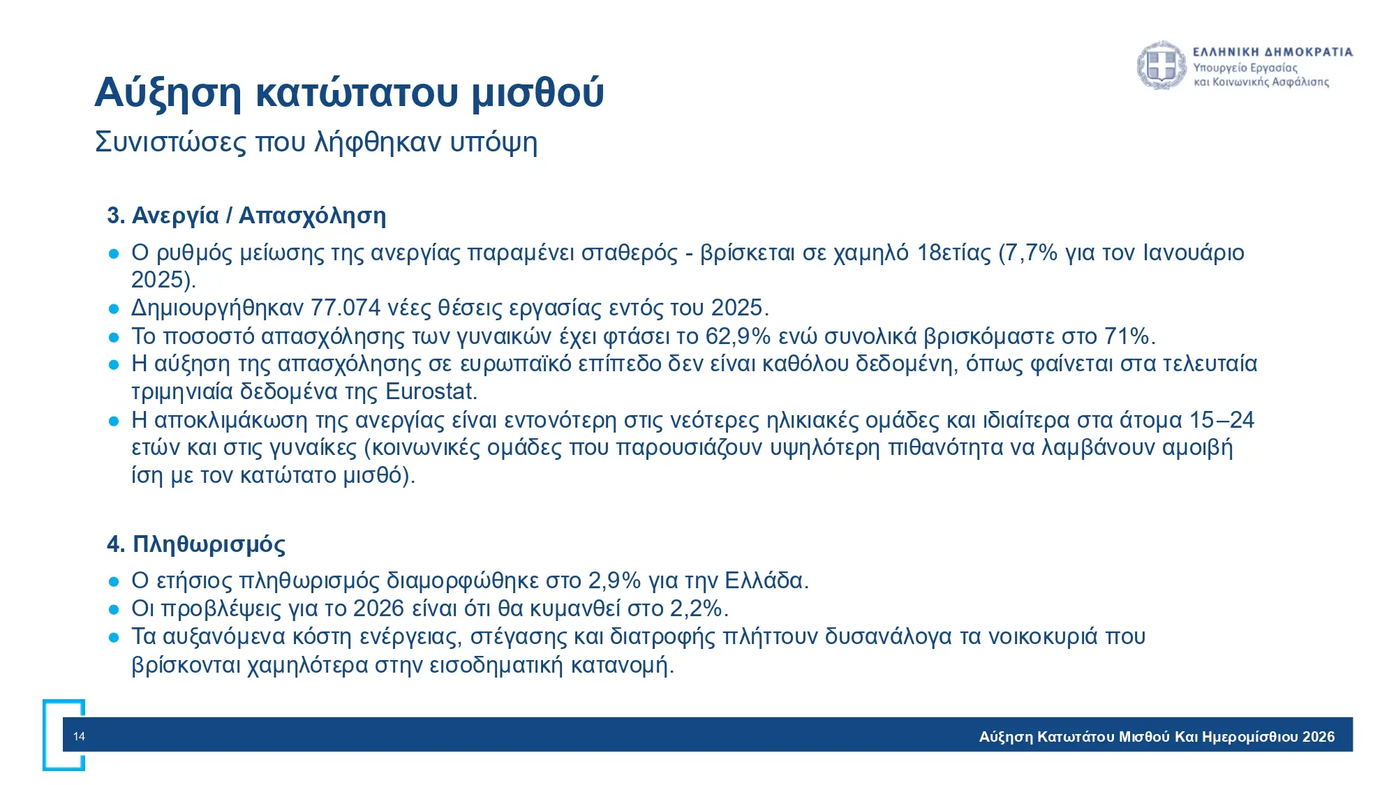 Ο νέος κατώτατος εφαρμόζεται άμεσα και στο δημόσιο (+40 ευρώ) και συμπαρασύρει επιδόματα ανεβάζοντας το δημοσιονομικό κόστος. Η αβεβαιότητα για το 2026 λόγω γεωπολιτικών εξελίξεων (Μέση Ανατολή, ενέργεια) επιβάλλει προσεκτική στάθμιση όλων των παραγόντων.