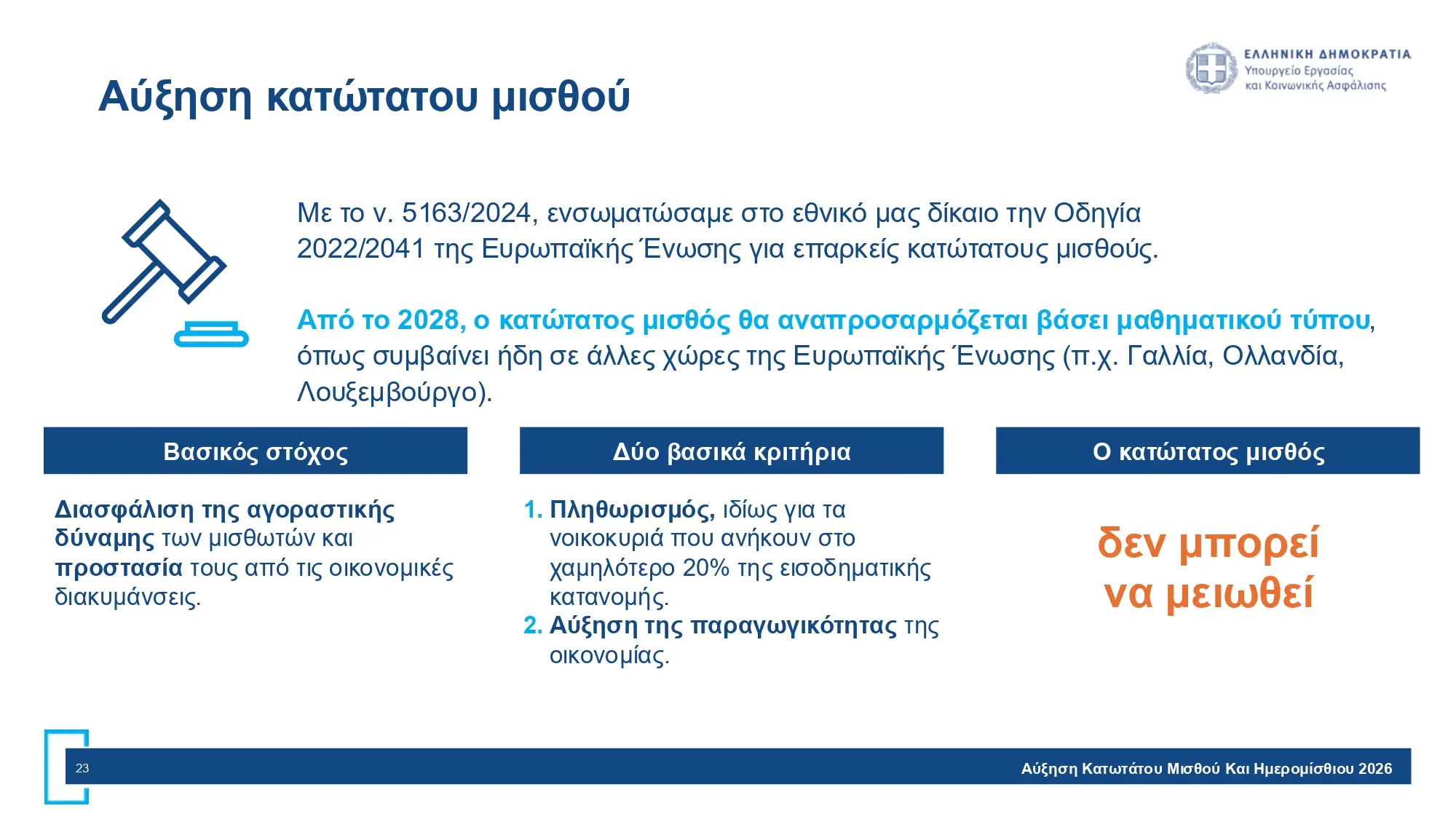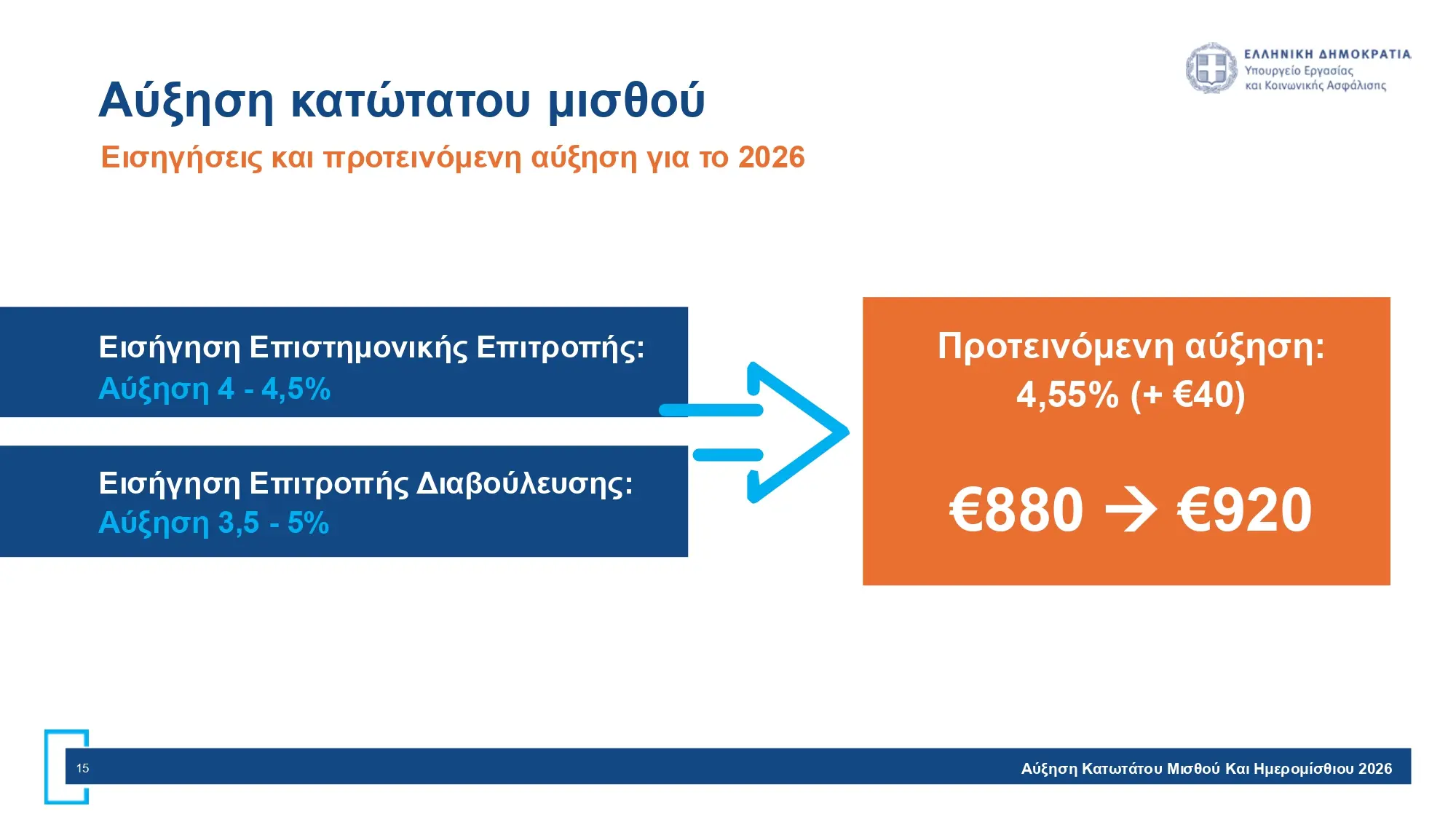 Εξηγώντας γιατί η α΄΄υξηση του κσαθιού είναι στα 920 ευρώ και όχι παραπάνω ή λιγότερο ερίποε: «Η προτεινόμενη αύξηση στα 920 ευρώ (≈4,5%) βρίσκεται εντός του εύρους (€910 – €924) που προκύπτει από την εισήγηση της Επιστημονικής Επιτροπής, διασφαλίζοντας ισορροπία. Η ελληνική οικονομία αναπτύσσεται (ΑΕΠ ~2,1%) επιτρέποντας την αύξηση κατά 40 ευρώ, που διασφαλίζει σταθερή και συνεχιζόμενη ενίσχυση του διαθέσιμου εισοδήματος εντός των δυνατοτήτων της οικονομίας, αλλά και των μικρών και μεσαίων επιχειρήσεων.