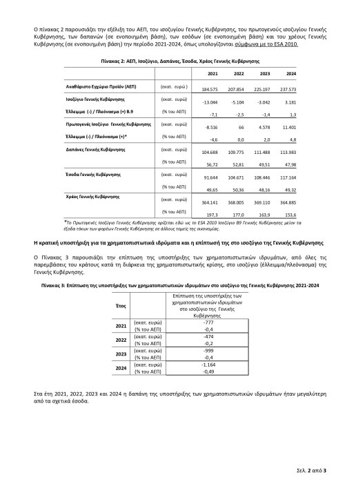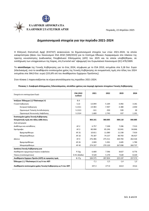 Το αποτέλεσμα της Γενικής Κυβέρνησης για το έτος 2024 (σύμφωνα με το ESA 2010), εκτιμάται στα 3,18 δισ. Ευρώ (πλεόνασμα), ενώ το ακαθάριστο ενοποιημένο χρέος της Γενικής Κυβέρνησης σε ονομαστικές τιμές στο τέλος του 2024 εκτιμάται στα 364,9 δισ. ευρώ (153,6% επί του Ακαθάριστου Εγχώριου Προϊόντος).