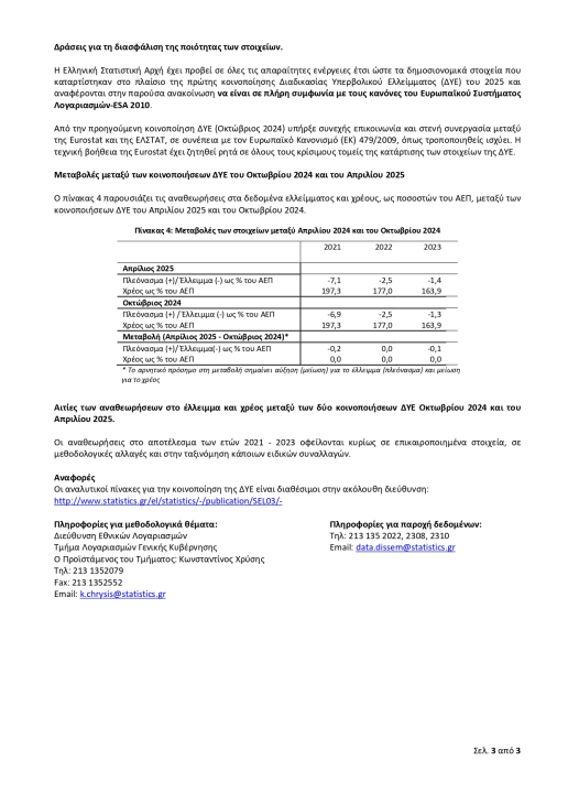 Σύμφωνα με την ΕΛΣΤΑΤ, το ΑΕΠ το 2024 ανήλθε στα 237,5 δισ. ευρώ, το πρωτογενές πλεόνασμα σε 11,401 δισ. ευρώ (έναντι 4,578 δισ. ευρώ πέρσι), ενώ το χρέος της γενικής κυβέρνησης ανήλθε στα 364,8 δισ. ευρώ ή στο 153,6% του ΑΕΠ (έναντι 163,9% του ΑΕΠ πέρσι).