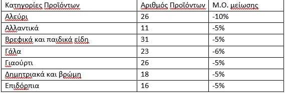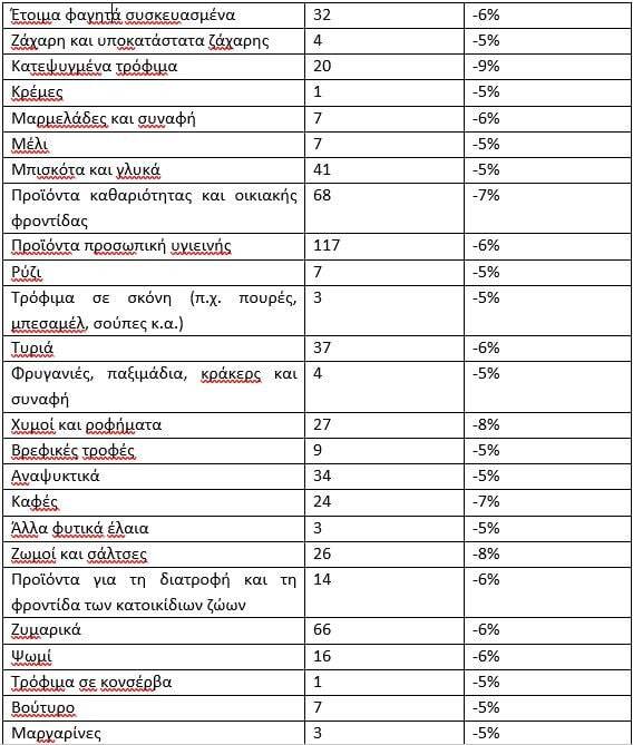 Ακολουθούν οι 37 κατηγορίες που εντάσσονται τα 770 προϊόντα καθώς και ο μέσος όρος μείωσης τιμής: