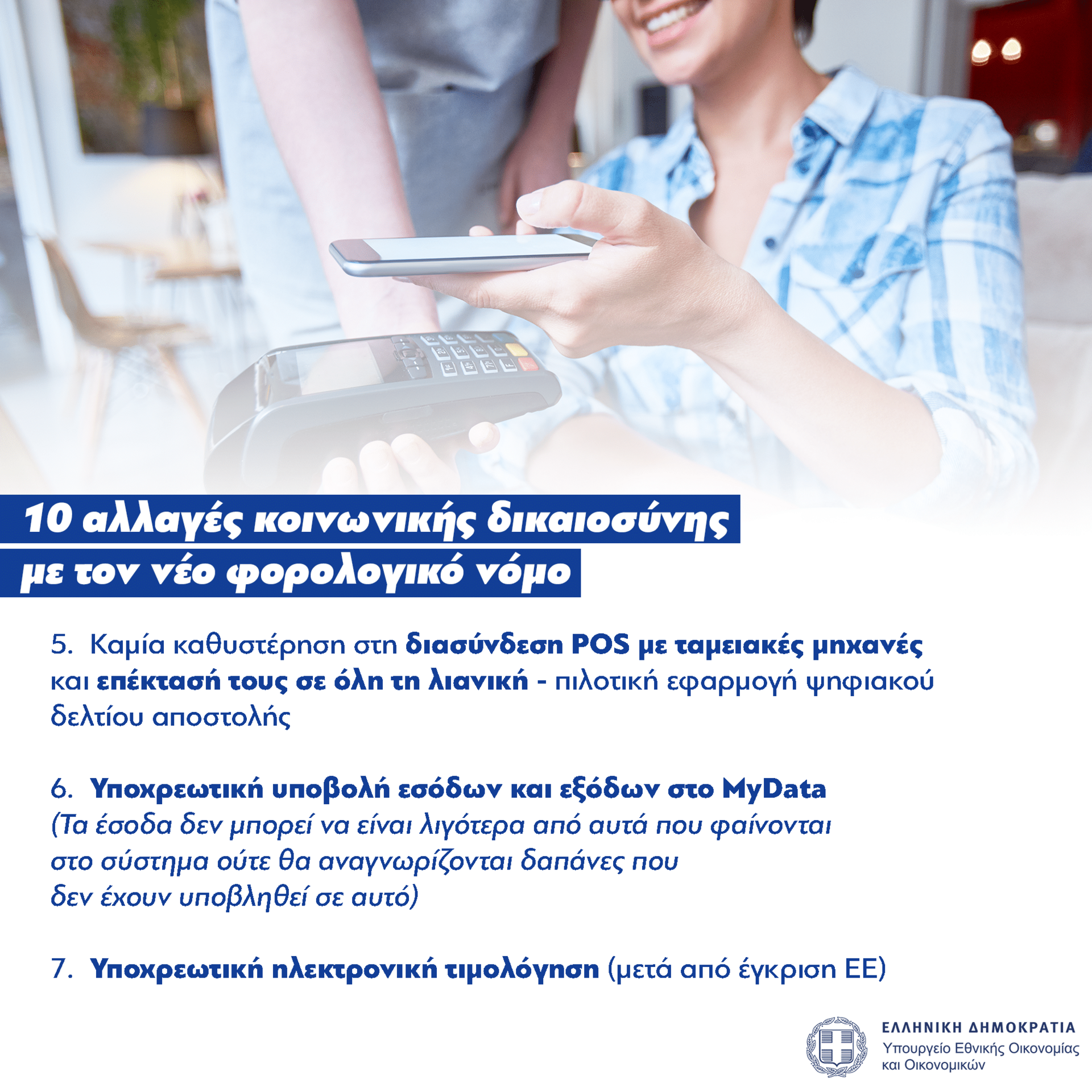 - Προχωρά άμεσα η διασύνδεση των POS με τις ταμειακές μηχανές. Η ολοκλήρωση της προγραμματίζεται για τους πρώτους μήνες του 2024. Επιπλέον, αναμένεται άμεσα η έκδοση της σχετικής ΚΥΑ, ώστε τα POS να επεκταθούν σε ολόκληρη τη λιανική.