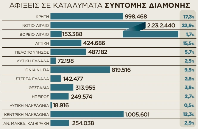 Τα Αirbnb αντιστοιχούν στο 40% των προσφερόμενων δωματίων. Στο σύνολο των καταλυμάτων αυτών παρατηρείται αύξηση στις αφίξεις 3,8% και στις διανυκτερεύσεις 3,9%. Το 2024 παρουσιάζεται αύξηση στις Περιφέρειες του Νοτίου Αιγαίου (5,6% στις αφίξεις και 8,2% στις διανυκτερεύσεις), της Κεντρικής Μακεδονίας (6,0% στις αφίξεις και 5,9% στις διανυκτερεύσεις), των Ιονίων Νήσων (5,6% στις αφίξεις και 3,9% στις διανυκτερεύσεις), της Αττικής (3,3% στις αφίξεις και 2,7% στις διανυκτερεύσεις) και της Κρήτης (1,8% τόσο στις αφίξεις και 0,6% διανυκτερεύσεις).