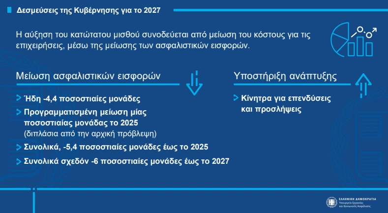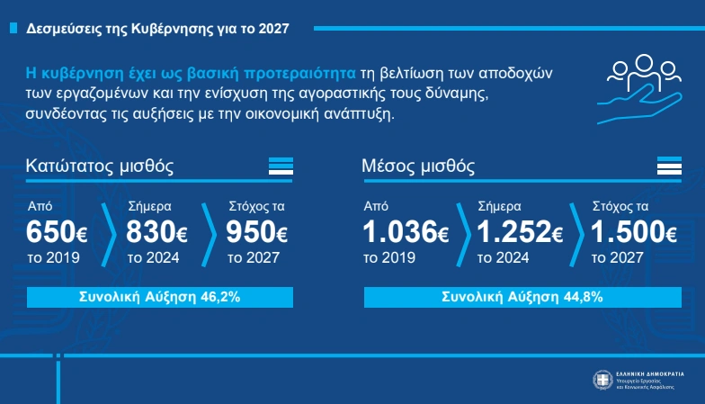 «Βασική προτεραιότητα της Κυβέρνησης», είπε η κ. Κεραμέως, «είναι η ενίσχυση του εισοδήματος των εργαζομένων και η αύξηση της αγοραστικής τους δύναμης, συνδέοντας το ύψος των μισθών με τον πληθωρισμό και την οικονομική ανάπτυξη της χώρας. Ο Πρωθυπουργός Κυριάκος Μητσοτάκης έχει δεσμευθεί για αύξηση του κατώτατου μισθού στα 950 ευρώ έως το 2027, ποσό που μεταφράζεται σε συνολική αύξηση 46,2% από το 2019, με παράλληλη μείωση των ασφαλιστικών εισφορών κατά 6 ποσοστιαίες μονάδες έως το 2027. Στην κατεύθυνση αυτή, ενσωματώνοντας την ευρωπαϊκή οδηγία 2022/2041, προτείνουμε έναν τρόπο υπολογισμού βασισμένο σε διαφανή, αντικειμενικά κριτήρια, που ωφελεί και διασφαλίζει τους εργαζόμενους».