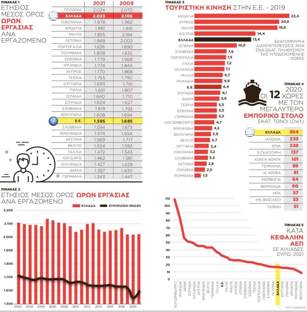 Τα στοιχεία της Eurostat (πίνακας 1) σημειώνουν ότι το 2021 ο μέσος εργαζόμενος στην Ελλάδα εργάστηκε 2.023 ώρες, ενώ οριακά χάνουμε την πρώτη θέση από τους Πολωνούς (έχουμε μόνο 1 ώρα διαφορά). Οι απασχολούμενοι σε δύο από τις πλουσιότερες χώρες της Ευρώπης, Γερμανία και Δανία, αφιερώνουν για εργασία γύρω στις 1.350 ώρες το έτος. Δηλαδή χρόνο που αντιστοιχεί στα 2/3 των ωρών που δουλεύουν οι Ελληνες. Η σχέση αυτή παραμένει διαχρονικά αμετάβλητη αν τη συγκρίνουμε με το 2008 το οποίο ήταν το τελευταίο κανονικό έτος προ της παγκόσμιας ύφεσης και της εφαρμογής των Μνημονίων.