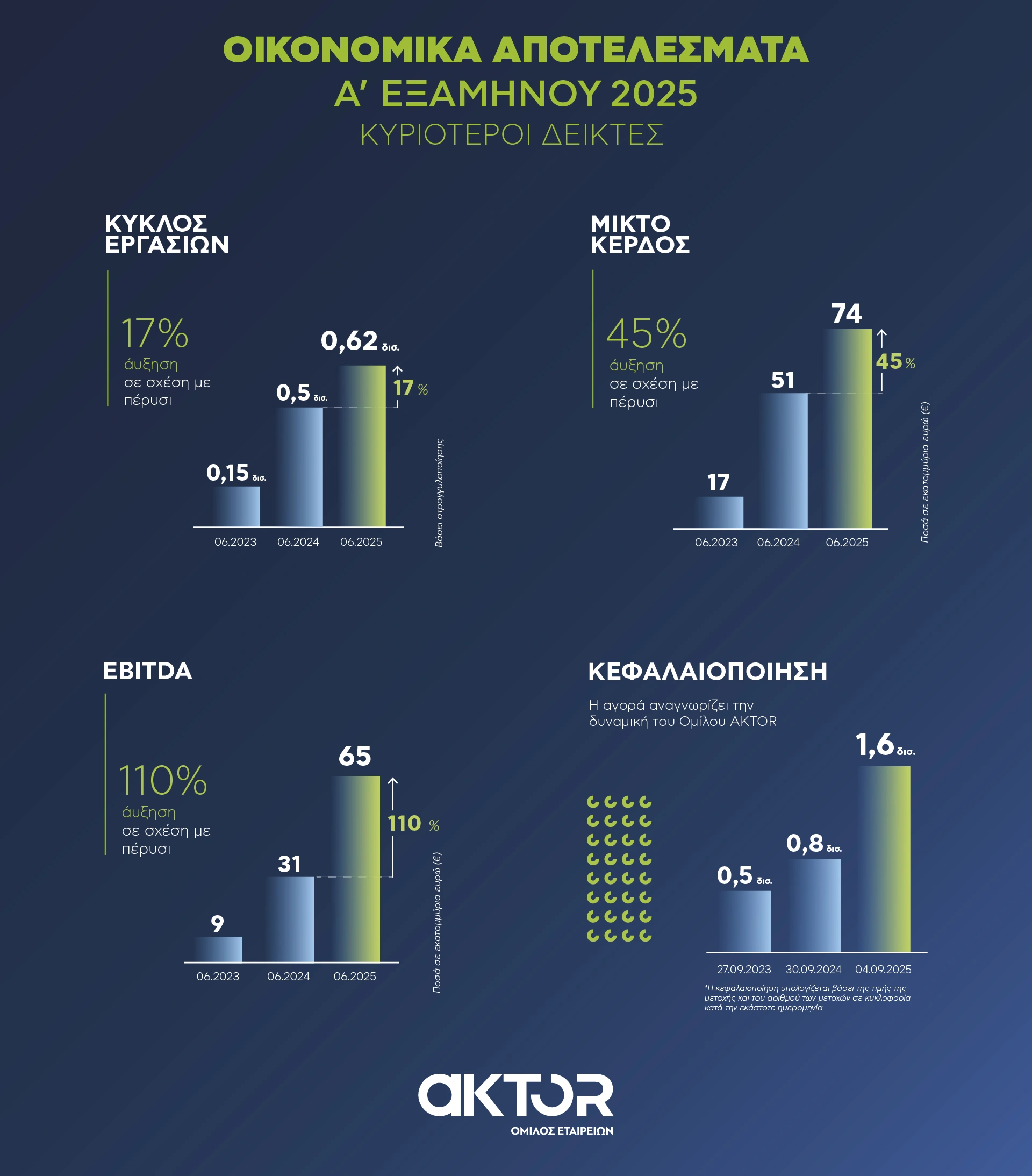 Και ο κ. Εξάρχου πρόσθεσε: « Το Α’ Εξάμηνο του έτους χαρακτηρίστηκε από σημαντική επιτάχυνση στην εκτέλεση των έργων μας και τον μετασχηματισμό του Ομίλου AKTOR. Έχοντας ως στόχο τη δημιουργία αξίας για τους μετόχους μας, προχωρούμε, μέσω εξαγορών και άλλων επενδύσεων, στην επέκταση σε νέους τομείς και την διαφοροποίηση του χαρτοφυλακίου μας, ώστε να είμαστε κατάλληλα τοποθετημένοι για την επόμενη μέρα της αγοράς της Νοτιοανατολικής Ευρώπης. Όλα αυτά δεν αποτυπώνονται μόνο στις θετικές οικονομικές μας επιδόσεις, αλλά αναγνωρίζονται και στην κεφαλαιοποίηση του Ομίλου AKTOR, η οποία ξεπέρασε το €1,5 δισ., είναι εννέα φορές υψηλότερη από τότε που η Winex Investments εισήλθε στο μετοχικό κεφάλαιο της εταιρείας το 2022, και αποτελεί ιστορικά υψηλή επίδοση και αναγνώριση των προσπαθειών όλων των ανθρώπων του Ομίλου μας. Η αξιοπιστία αποτελεί την κορυφαία εταιρική μας αξία και τον βασικό γνώμονα με τον οποίο εργαζόμαστε καθημερινά».