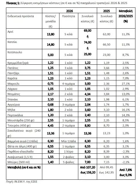 Η εκτίμηση του κόστους για το φετινό πασχαλινό τραπέζι (4-6 ατόμων) κυμαίνεται από 107,20 έως 156,20 ευρώ. Ως εκ τούτου, οι καταναλωτές θα αγοράσουν το ίδιο, σε σχέση με πέρυσι, καλάθι αγαθών, ακριβότερα κατά 7,8% έως 9,3%, Το εύρος των τιμών δικαιολογείται από την καταγραφή σειράς προϊόντων διαφορετικής ποιότητας, σε αρκετές τοπικές αγορές και διαφορετικούς τύπους καταστημάτων. Επιπρόσθετα, διευκρινίζεται ότι οι τιμές των προϊόντων που εμφανίζονται στους Πίνακες (1 & 2) είναι ενδεικτικές και επιχειρούν να χαρτογραφήσουν τη γενική κατανομή τιμών και την εικόνα της αγοράς (βλ. μεθοδολογικό σημείωμα).