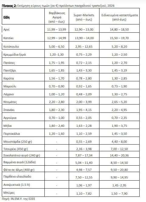 «Το Ινστιτούτο της ΕΣΕΕ αποτυπώνει και φέτος τις τιμές των προϊόντων του πασχαλινού τραπεζιού, εν μέσω έντονης διεθνούς αβεβαιότητας. Οι τιμές των τροφίμων για το πασχαλινό τραπέζι κινούνται για άλλη μία χρονιά ανοδικά, επιβαρύνοντας τα νοικοκυριά και τις περιορίζοντας τις δαπάνες για άλλα αγαθά. Η σημαντική αύξηση του φετινού πασχαλινού τραπεζιού οφείλεται: α) Στη διόγκωση του κόστους παραγωγής και μεταφοράς εξαιτίας της ανόδου των τιμών ενέργειας, β) στις ασθένειες που έπληξαν το ζωικό κεφάλαιο και γ) στο γεγονός ότι φέτος ορθόδοξο και καθολικό Πάσχα διαφέρουν μόνο κατά μία εβδομάδα, εξέλιξη που ενισχύει τη ζήτηση σε συγκεκριμένο χρονικό διάστημα. Οι τιμές στα σοκολατένια αυγά παρέμειναν στα ίδια περίπου με τα περυσινά επίπεδα, ενώ υπενθυμίζεται πως το 2025 είχε σημειωθεί ισχυρή αύξηση εξαιτίας της διόγκωσης της τιμής του κακάο. Σε κάθε περίπτωση, το μειωμένο διαθέσιμο εισόδημα κατευθύνεται περισσότερο στην κάλυψη των απαραίτητων αγαθών για το πασχαλινό τραπέζι μειώνοντας τις αυθόρμητες αγορές σε μία περίοδο που η παράταση των γεωπολιτικών εντάσεων προκαλεί προβληματισμό στην αγορά, αν και πέραν των τροφίμων και των καυσίμων δεν καταγράφονται, έως τώρα, ανατιμήσεις στα υπόλοιπα προϊόντα».