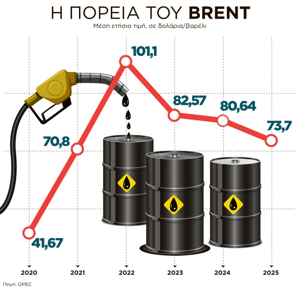 Το κέρδος για την Ελλάδα και τις υπόλοιπες χώρες του ιδίου μεγέθους οι οποίες δεν παράγουν πετρέλαιο είναι προφανές. Το προσχέδιο του Προϋπολογισμού, το οποίο κατατέθηκε προχθές στη Βουλή, έχει ως βασική παραδοχή μία μέση τιμή πετρελαίου για το 2026 στα 67,7 δολάρια το βαρέλι. Με τις τελευταίες εξελίξεις στη διεθνή αγορά το πετρέλαιο αναμένεται να κινηθεί σε μέσα επίπεδα τιμών για όλο τον επόμενο χρόνο λίγο πάνω από τα 60 δολάρια το βαρέλι.