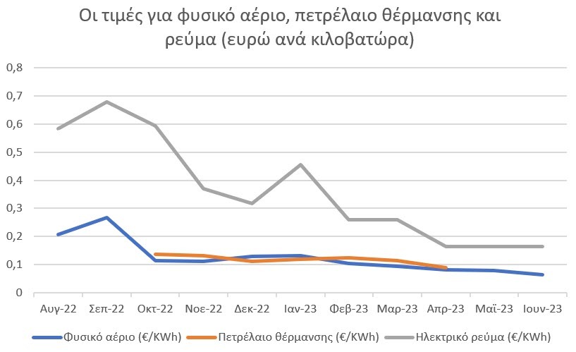 Αντίστοιχες διακυμάνσεις κατά τη διάρκεια της χειμερινής περιόδου σημείωσαν και οι τιμές του φυσικού αερίου, το οποίο για ορισμένους μήνες ήταν ακριβότερο από το πετρέλαιο θέρμανσης. Η τιμή της ηλεκτρικής ενέργειας σημείωσε θεαματική πτώση από τα ιστορικά υψηλά του καλοκαιριού του 2022, ωστόσο παραμένει ακριβότερη από το πετρέλαιο και το αέριο.