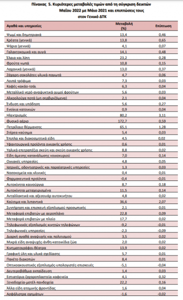 Σύμφωνα με τα στοιχεία της ΕΛΣΤΑΤ η αύξηση του Γενικού ΔΤΚ κατά 11,3% τον μήνα Μάιο 2022, σε σύγκριση με τον αντίστοιχο Δείκτη του Μαΐου 2021, προήλθεκυρίως από τις μεταβολές στις ακόλουθες ομάδες αγαθών και υπηρεσιών:
