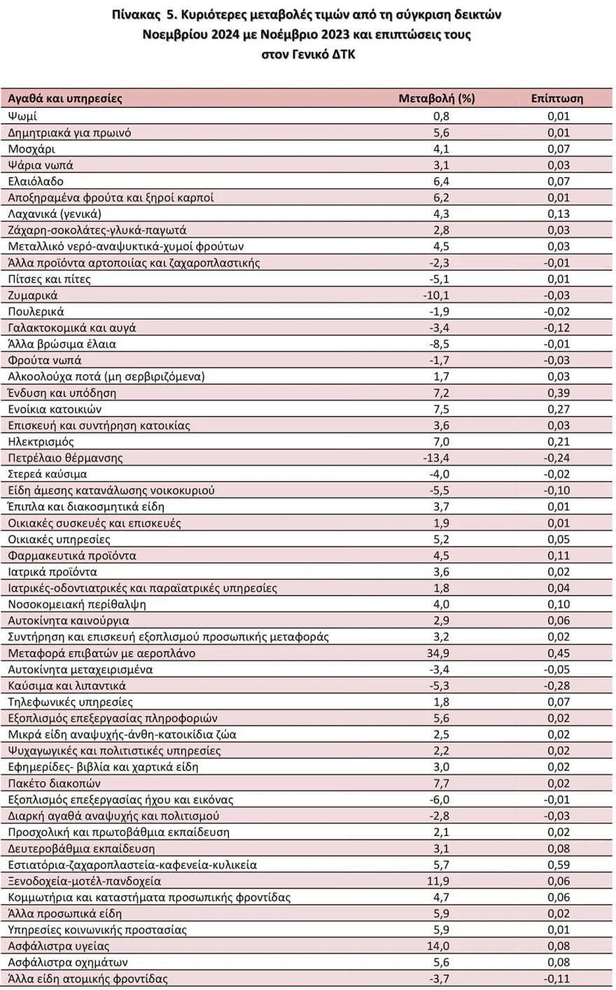 Η αύξηση του Γενικού ΔΤΚ κατά 2,4% τον μήνα Νοέμβριο 2024 προήλθε κυρίως από τις μεταβολές στις ακόλουθες ομάδες αγαθών και υπηρεσιών: