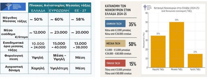 Στην Ελλάδα το μέσο ισοδύναμο διαθέσιμο εισόδημα το 2024 κυμαινόταν μεταξύ 11.000-12.000 ευρώ ετησίως ανά άτομο και το κατώφλι της μεσαίας τάξης ήταν περίπου τα 10.000 ευρώ, ενώ το ανώτερο όριο ήταν μεταξύ 22.000-24.000 ευρώ ανά άτομο ετησίως. Αυτή η εισοδηματική κλίμακα για μια τετραμελή οικογένεια αντιστοιχεί σε καθαρό ετήσιο εισόδημα από 24.000 έως 60.000 ευρώ, με την προϋπόθεση ότι, οι ενήλικες που εργάζονται αμείβονται με 2.000-5.000 ευρώ τον μήνα. Η μεσαία τάξη δεν είναι ασφαλώς μόνο θέμα εισοδήματος, αλλά και βιοτικού επιπέδου, επαγγέλματος και μόρφωσης. Παραδοσιακά στη χώρα μας η μεσαία τάξη περιλαμβάνει τους ελεύθερους επαγγελματίες, μικρομεσαίους επιχειρηματίες, αυτοαπασχολούμενους, δημόσιους υπαλλήλους, στελέχη του ιδιωτικού τομέα και επιστήμονες, όπως γιατρούς, δικηγόρους και μηχανικούς. Επίσης, στη μεσαία τάξη συγκαταλέγονται τα νοικοκυριά που διαθέτουν ιδιόκτητη κατοικία, αυτοκίνητο και μπορούν να καλύψουν βασικές και καταναλωτικές τους ανάγκες.