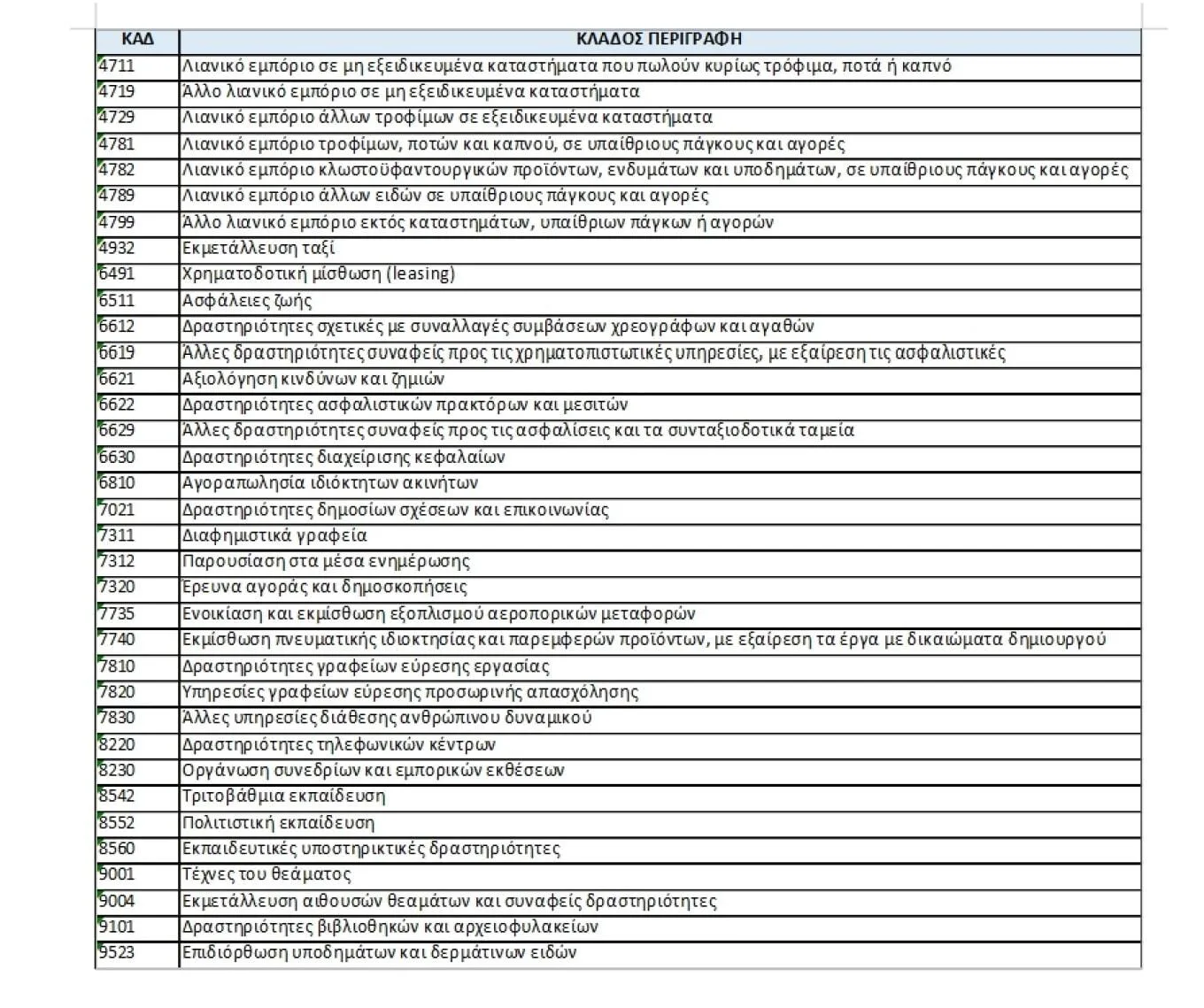 Οι νέοι ΚΑΔ εμφανίζονται στον παρακάτω πίνακα: