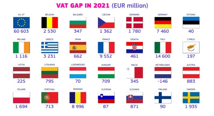 Η ετήσια μελέτη «VAT Gap», η οποία μετρά τη διαφορά μεταξύ των θεωρητικά αναμενόμενων εσόδων ΦΠΑ και του ποσού που πράγματι εισπράχθηκε, δείχνει ότι τα κράτη μέλη έχασαν περίπου 61 δισ. ευρώ σε ΦΠΑ το 2021, έναντι 99 δισ. ευρώ το 2020.