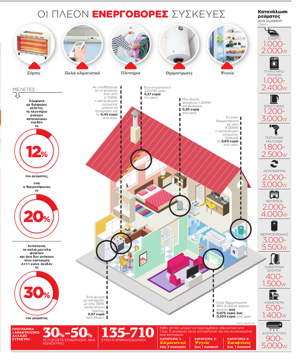 Οπως εξηγούν πηγές στον Ελεύθερο Τύπο της Κυριακής, ενεργοβόρες είναι αρκετές συσκευές που βρίσκονται σε ένα σπίτι αλλά σημαντική ενέργεια καταναλώνουν τα παλιά κλιματιστικά, τα πλυντήρια, ο θερμοσίφωνας και τα ψυγεία. Ωστόσο, όπως διευκρινίζουν, κάθε νοικοκυριό χρησιμοποιεί διαφορετικά τις συσκευές, αφού για παράδειγμα ένας εργένης δεν βάζει τόσο συχνά πλυντήριο, όπως μια 4μελής οικογένεια.