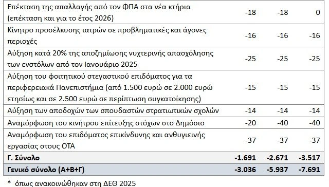 *ενίσχυση των στελεχών των Ενόπλων Δυνάμεων και των Σωμάτων Ασφαλείας με το επίδομα ιδιαίτερων συνθηκών εργασίας και επικινδυνότητας ύψους 100 ευρώ μηνιαίως, με εκτιμώμενο συνολικό κόστος 111 εκατ. ευρώ για το 2025 και 222 εκατ. ευρώ για το 2026.