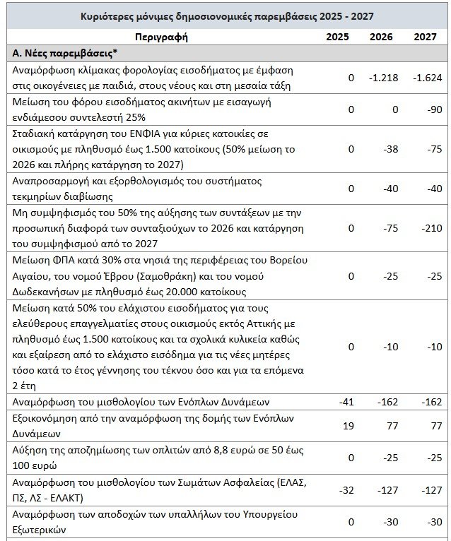 *αναμόρφωση του μισθολογίου των Ενόπλων Δυνάμεων με αυξήσεις εφαρμοζόμενες από τον Οκτώβριο 2025, ετήσιου κόστους 162 εκατ. ευρώ (καθαρού κόστους 85 εκατ. ευρώ μετά την αναδιάρθρωση της δομής των Ενόπλων Δυνάμεων) και των Σωμάτων Ασφαλείας (Ελληνική Αστυνομία, Πυροσβεστικό Σώμα, Λιμενικό Σώμα – Ελληνική Ακτοφυλακή), ετήσιου κόστους 127 εκατ. ευρώ,