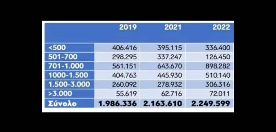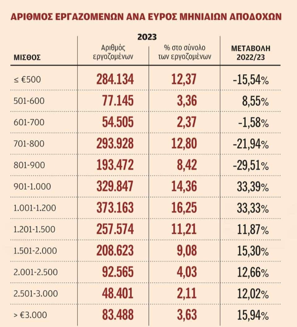 * Το 2019, 561.151 μισθωτοί (δηλαδή 28,2% επί του συνόλου των εργαζομένων) αμείβονταν με μισθό μεταξύ 700 και 1000 ευρώ. Το 2023, οι εργαζόμενοι που αμείβονταν με μισθό μεταξύ 700 και 1000 ευρώ αυξήθηκαν σε 817.247. Αυτό σημαίνει ότι οι εργαζόμενοι σε αυτή την κλίμακα αυξήθηκαν σε 4 χρόνια στο 35,6% επί του συνόλου των εργαζομένων. 256.096 εργαζόμενοι προστέθηκαν σε αυτή την εισοδηματική κατηγορία και απέκτησαν υψηλότερα εισοδήματα.