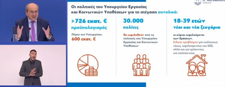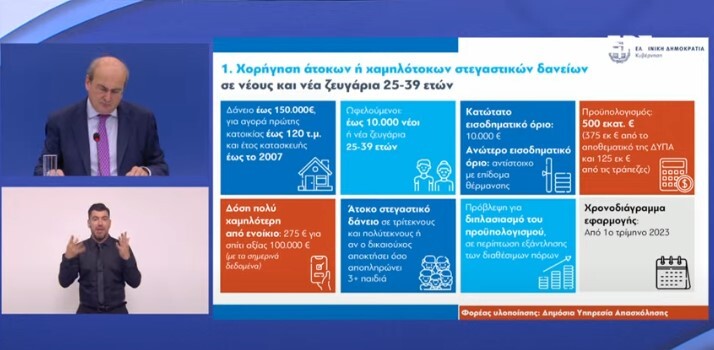 Για νέους και ζευγάρια 25 έως 39 ετών, όπως ανακοίνωσε ο υπουργός Εργασίας Κωστής Χατζηδάκης, θα χορηγηθούν άτοκα ή χαμηλότοκα στεγαστικά δάνεια.