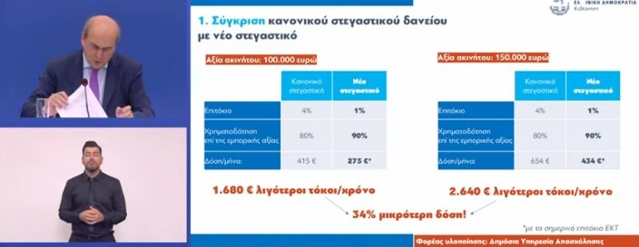 Το πρόγραμμα χαμηλότοκου δανεισμού είναι ύψους 500 εκατ. ευρώ. Τα στεγαστικά δάνεια για 25.000 νέους και ζευγάρια έως 39 ετών θα έχουν επιτόκιο 1%. Όλες οι λεπτομέρειες για το «Σπίτι μου» παρουσιάστηκαν από τους υπουργούς Εργασίας, Κωστή Χατζηδάκη, Περιβάλλοντος, Κώστα Σκρέκα, Παιδείας, Νίκη Κεραμέως, Επικρατείας, Άκη Σκέρτσο και τον διοικητή της ΔΥΠΑ, Σπύρο Πρωτοψάλτη.