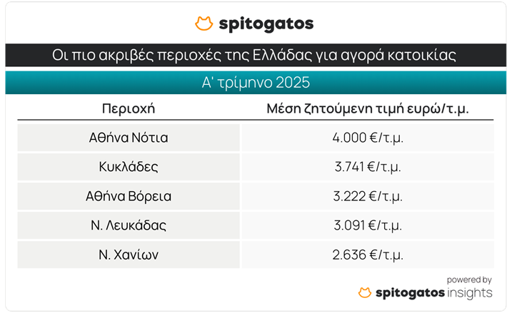Τα Νότια Προάστια της Αττικής συνεχίζουν να βρίσκονται στην κορυφή της κατάταξης ως η ακριβότερη περιοχή για αγορά κατοικίας κατά το 1ο τρίμηνο του 2025. Στη δεύτερη θέση βρίσκονται οι Κυκλάδες, συνεχίζοντας να προσελκύουν έντονο ενδιαφέρον από εγχώριους και διεθνείς αγοραστές. Ακολουθούν τα Βόρεια Προάστια της Αθήνας, γνωστά για το πράσινο και την υψηλή ποιότητα ζωής που προσφέρουν, καθώς και ο Νομός Λευκάδας. Τo top 5 συμπληρώνει ένας από τους δημοφιλέστερους προορισμούς της Κρήτης, τα Χανιά, με μέση ζητούμενη τιμή 2.636 €/τ.μ.