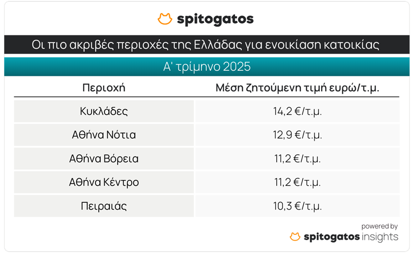 Σε ό,τι αφορά την ενοικίαση κατοικιών, οι Κυκλάδες παίρνουν την πρωτιά των πιο ακριβών περιοχών της χώρας με μέση ζητούμενη τιμή στα 14,2 €/τ.μ. Ακολουθούν τα Νότια και τα Βόρεια Προάστια της Αθήνας, το Κέντρο της Αθήνας και ο Πειραιάς. Αξίζει να σημειωθεί ότι η Χαλκιδική συνεχίζει να έχει από τις υψηλότερες μέσες ζητούμενες τιμές ενοικίασης σε όλη τη χώρα και το 1ο τρίμηνο του 2025, γεγονός που οφείλεται στην εκτεταμένη τουριστική περίοδο και την πληθώρα επιλογών βραχυχρόνιας μίσθωσης.