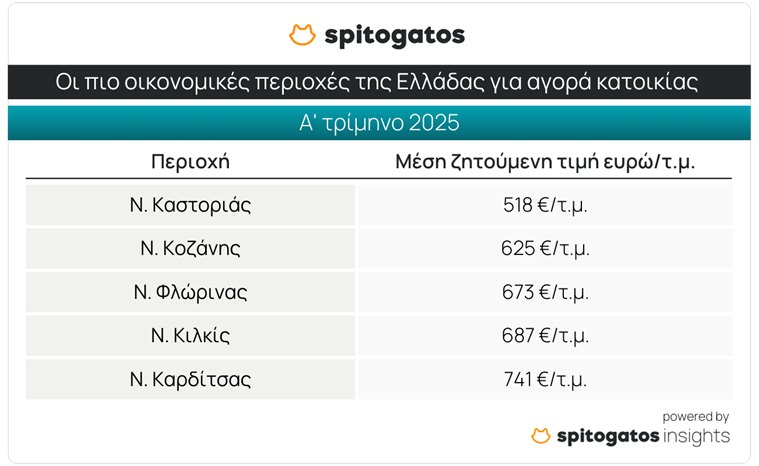 Σύμφωνα με τα τελευταία στοιχεία, οι πιο οικονομικές περιοχές για αγορά κατοικίας στην Ελλάδα είναι οι Νομοί Καστοριάς και Κοζάνης, ενώ ακολουθούν οι Νομοί Φλώρινας, Κιλκίς και Καρδίτσας. Στον τομέα της ενοικίασης, οι χαμηλότερες μέσες ζητούμενες τιμές καταγράφονται στον Νομό Κιλκίς, το Υπόλοιπο Νομού Θεσσαλονίκης, καθώς και στους Νομούς Πέλλας, Καστοριάς και Ημαθίας.