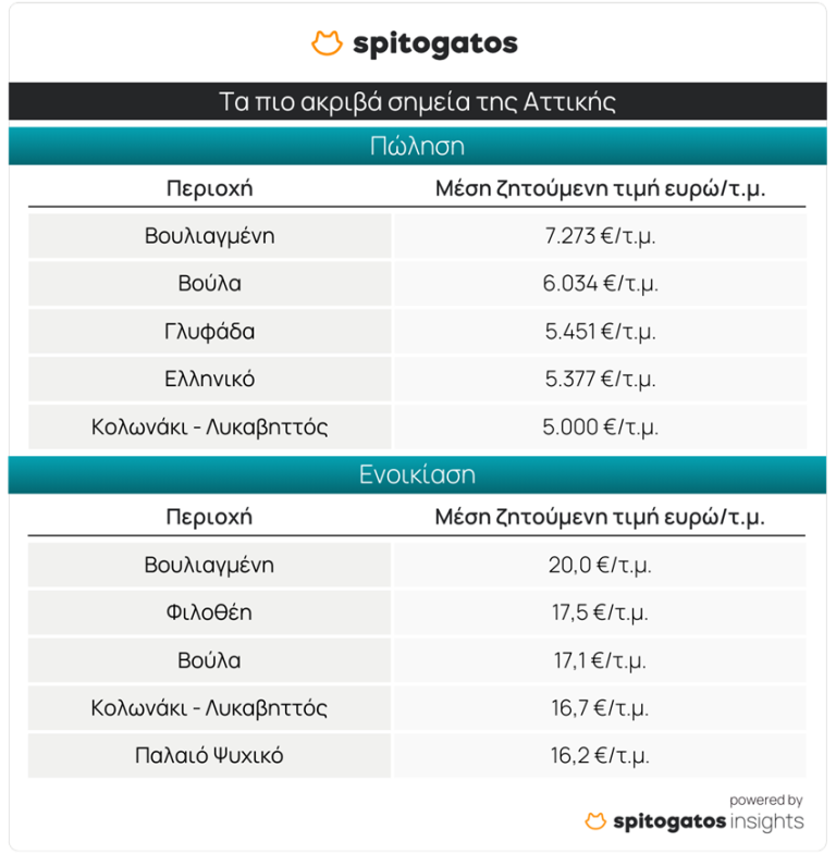 Σύμφωνα με τους αναλυτές του Spitogatos.gr είναι οι περιοχές των Νοτίων Προαστίων που βρίσκονται κατά κύριο λόγο στην κορυφή της κατάταξης των top 5 πιο ακριβών σημείων της Αττικής για αγορά κατοικίας κατά το 1ο τρίμηνο του 2025. Η Βουλιαγμένη αναδεικνύεται ως η ακριβότερη περιοχή της Αττικής για αγορά κατοικίας, με τη μέση ζητούμενη τιμή να διαμορφώνεται στις 7.273 €/τ.μ. Ακολουθούν η Βούλα, η Γλυφάδα, το Ελληνικό και η περιοχή Κολωνάκι-Λυκαβηττός. Αντίστοιχα, στην ενοικίαση κατοικιών, η Βουλιαγμένη παραμένει η ακριβότερη περιοχή της Αττικής, με τη μέση ζητούμενη τιμή να ανέρχεται στα 20 €/τ.μ. Τη λίστα των πιο ακριβών περιοχών για ενοικίαση συμπληρώνουν η Φιλοθέη, η Βούλα, το Κολωνάκι-Λυκαβηττός και το Παλαιό Ψυχικό.
