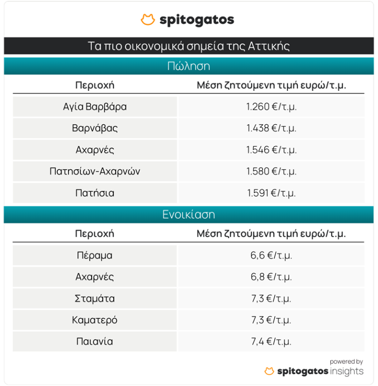 Σύμφωνα με τα στοιχεία του πρώτου τριμήνου του 2025, οι πιο οικονομικές περιοχές για αγορά κατοικίας εντοπίζονται κυρίως στα Δυτικά και Ανατολικά Προάστια, αλλά και στο Κέντρο της Αθήνας. Στην κορυφή της λίστας βρίσκεται η Αγία Βαρβάρα στα Δυτικά Προάστια, ενώ οικονομικές επιλογές εντοπίζονται επίσης στον Βαρνάβα στα Ανατολικά, στις Αχαρνές, στην περιοχή Πατησίων-Αχαρνών και στα Πατήσια. Για όσους ενδιαφέρονται για ενοικίαση κατοικίας, οι πιο χαμηλές μέσες ζητούμενες τιμές στην Αττική καταγράφονται στο Πέραμα, στα Προάστια του Πειραιά, καθώς και στις Αχαρνές, τη Σταμάτα, το Καματερό και την Παιανία. Οι περιοχές αυτές συνεχίζουν να προσελκύουν ενδιαφέρον από όσους αναζητούν οικονομική κατοικία εντός της Αττικής, χάρη στον συνδυασμό χαμηλών τιμών και των αναπτυσσόμενων τοπικών αγορών.