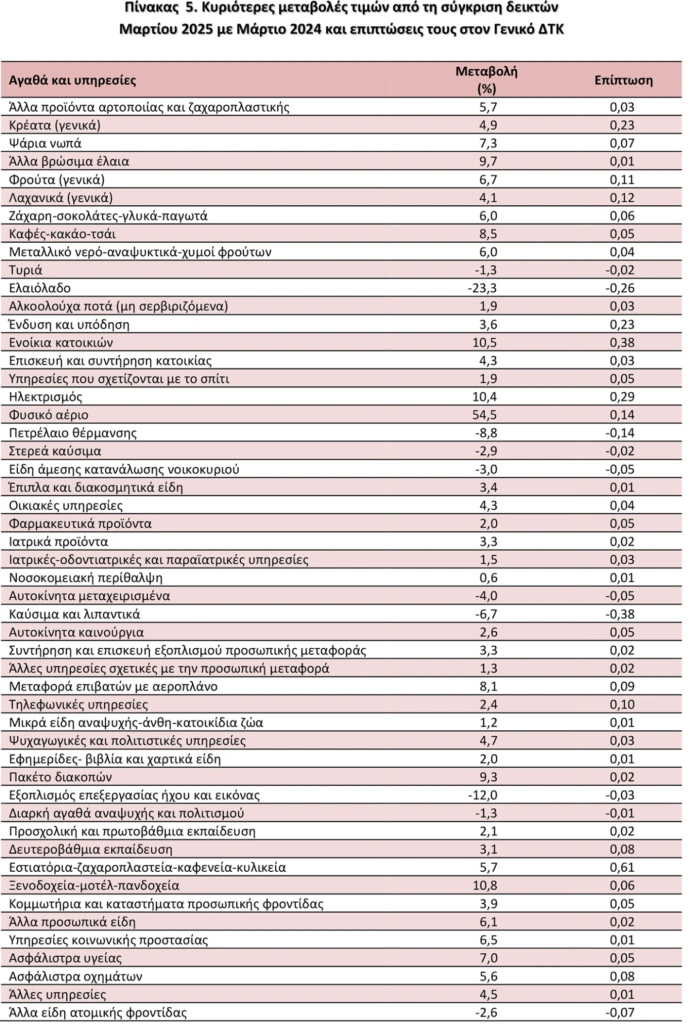 Αναλυτικά, η αύξηση του Γενικού Δείκτη Τιμών Καταναλωτή κατά 2,4% τον Μάρτιο 2025 προήλθε κυρίως από τις μεταβολές στις ακόλουθες ομάδες αγαθών και υπηρεσιών: