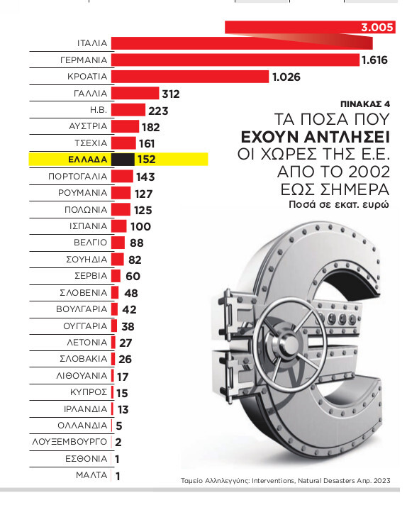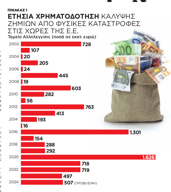Η ποσοτικοποίηση της ζημιάς είναι προφανώς μια δύσκολη άσκηση που όμως πρέπει να γίνει εφόσον προχωρούμε σε αναθεώρηση του μεσοπρόθεσμου προϋπολογισμού του Δημοσίου και παράλληλα θέτει η Ελλάδα αίτημα βοήθειας προς το Ταμείο Αλληλεγγύης που καλύπτει ζημιές από φυσικές καταστροφές στα μέλη της Ε.Ε. από το 2002. Τα κεφάλαια μάλιστα που έχουν εκταμιευτεί προς όλες τις ευρωπαϊκές χώρες συμποσούνται μέχρι σήμερα σε 9,5 δισ. ευρώ (πίνακας 1). Υπάρχει ένα ετήσιο πλαφόν 500 εκατομμυρίων, τα υπόλοιπα χρήματα του οποίου όταν δεν χρησιμοποιούνται μεταφέρονται από έτος σε έτος με αποτέλεσμα να βλέπουμε χρονιές με εκταμιεύσεις μόνο 16 εκατομμυρίων, όπως το 2015, αλλά και κορυφές έως 1,6 δισ. το 2020 όταν η πανδημία του Covid-19 σάρωσε όλους τους προϋπολογισμούς των μελών της Ε.Ε. Τα ποσά που αναφέρονται στον συγκεκριμένο πίνακα δεν αντιπροσωπεύουν το σύνολο των χρημάτων που διατίθενται για την αποκατάσταση της καταστροφής, αλλά μόνο ένα μικρό ποσοστό της τάξης του 3%-4% το οποίο συνεισφέρει η Ε.Ε. και συμπληρώνουν οι εθνικοί πόροι. Συγκρινόμενες μάλιστα οι εκταμιεύσεις που αφιερώνει η Ε.Ε. για τα μέλη της με ό,τι ξοδεύεται ετησίως στις ΗΠΑ, αποτελούν ένα μικροσκοπικό μέγεθος. Πιο συγκεκριμένα, στις ΗΠΑ δαπανώνται κατά μέσο όρο σε κάθε περίπτωση πλημμύρας κάποια $5 δισ., ενώ στην περίπτωση των τυφώνων η μέση δαπάνη για την κάλυψη των ζημιών ανέρχεται στα $23 δισ.