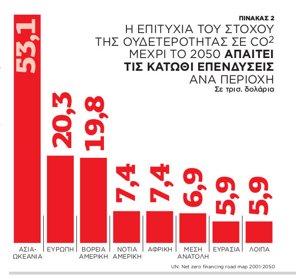 Μια εκτίμηση των ποσών που απαιτούνται για την κάλυψη καταστροφών στις περιοχές όλης της Γης μελετήθηκε από μελέτη που χρηματοδότησαν τα Ηνωμένα Εθνη (πίνακας 2). Το μέγεθος των ζημιών και τα ποσά που πρέπει να δαπανηθούν ανά περιοχή προκειμένου να επιτύχουμε την ουδετερότητα στις εκπομπές CO2 φτάνουν τα $125 τρισ. Τεράστιο και αποστομωτικό ποσό για όποιους αγνοούν την καταστροφή που έχει γίνει στον πλανήτη. Οσο όμως οι μη ανεπτυγμένες χώρες παλεύουν για οικονομική επιβίωση, τα ορυκτά καύσιμα κυριαρχούν στον τομέα της ενέργειας και τα απολυταρχικά κράτη που ποδοπατούν ασύστολα το περιβάλλον παραμένουν εν ζωή, ο αγώνας είναι άνισος και η λύση δεν είναι αυτή τη στιγμή ορατή.