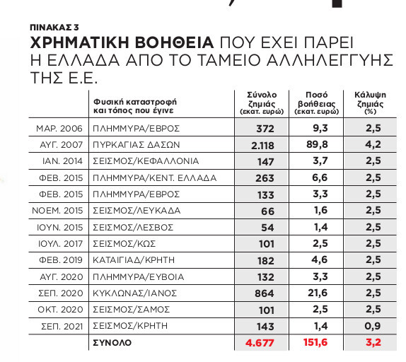 Τι έχουμε κάνει και πόσα χρήματα έχουν δαπανηθεί στην Ελλάδα προκειμένου να αντιμετωπιστούν τα ακραία φυσικά φαινόμενα; Ο πίνακας 3 είναι αποκαλυπτικός. Τα απολογιστικά στοιχεία του Ταμείου Αλληλεγγύης (EUSF) δείχνουν τις προσπάθειες της χώρας μας να βοηθηθεί από τα ποσά που παρέχει για φυσικές καταστροφές το συγκεκριμένο Ταμείο. Στη δική μας περίπτωση αυτά έχουν διατεθεί για πλημμύρες και σεισμούς κυρίως, αλλά συμπεριλαμβάνονται και οι ζημιές από τις πυρκαγιές στα δάση, τις καταιγίδες και τον κυκλώνα Ιανό του 2020. Το πρώτο που παρατηρούμε είναι ότι από το σύνολο της ζημιάς που έχει εκτιμηθεί και πιστοποιηθεί από τις αρμόδιες υπηρεσίες της Ε.Ε., μόνο ένα μικρό ποσοστό έχει δοθεί ως βοήθεια.