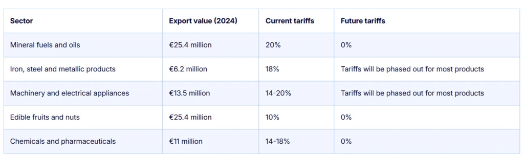 Χαμηλότεροι έως μηδενικοί δασμοί, περισσότερες και φθηνότερες εξαγωγές: Η συμφωνία θα εξαλείψει τους δασμούς στο 91% όλων των προϊόντων, ωφελώντας ουσιαστικά όλες τις ελληνικές εξαγωγές. Χαμηλότεροι έως μηδενικοί δασμοί, περισσότερες και φθηνότερες εξαγωγές