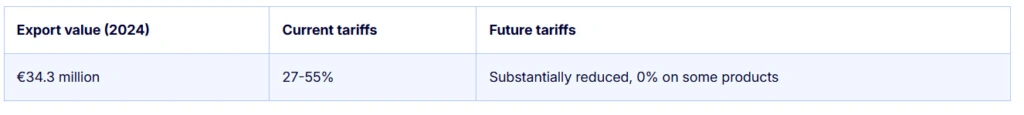 Η συμφωνία θα εξαλείψει τους δασμούς στο 91% όλων των προϊόντων, ωφελώντας ουσιαστικά όλες τις ελληνικές εξαγωγές.