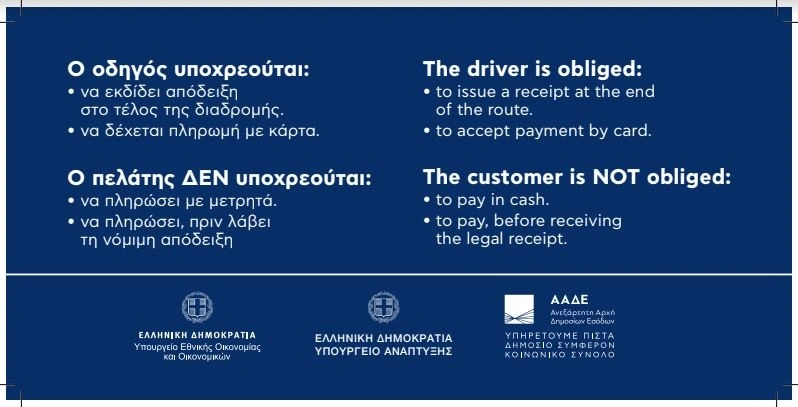 Παρά τις αντιδράσεις, οι οδηγοί ταξί θα πρέπει να τοποθετήσουν στο πίσω δεξιά τζάμι των οχημάτων τους τις ειδικές αυτοκόλλητες ταμπέλες, με τις οποίες ενημερώνονται οι καταναλωτές σχετικά με την υποχρέωση αποδοχής καρτών πληρωμών από τους αυτοκινητιστές.