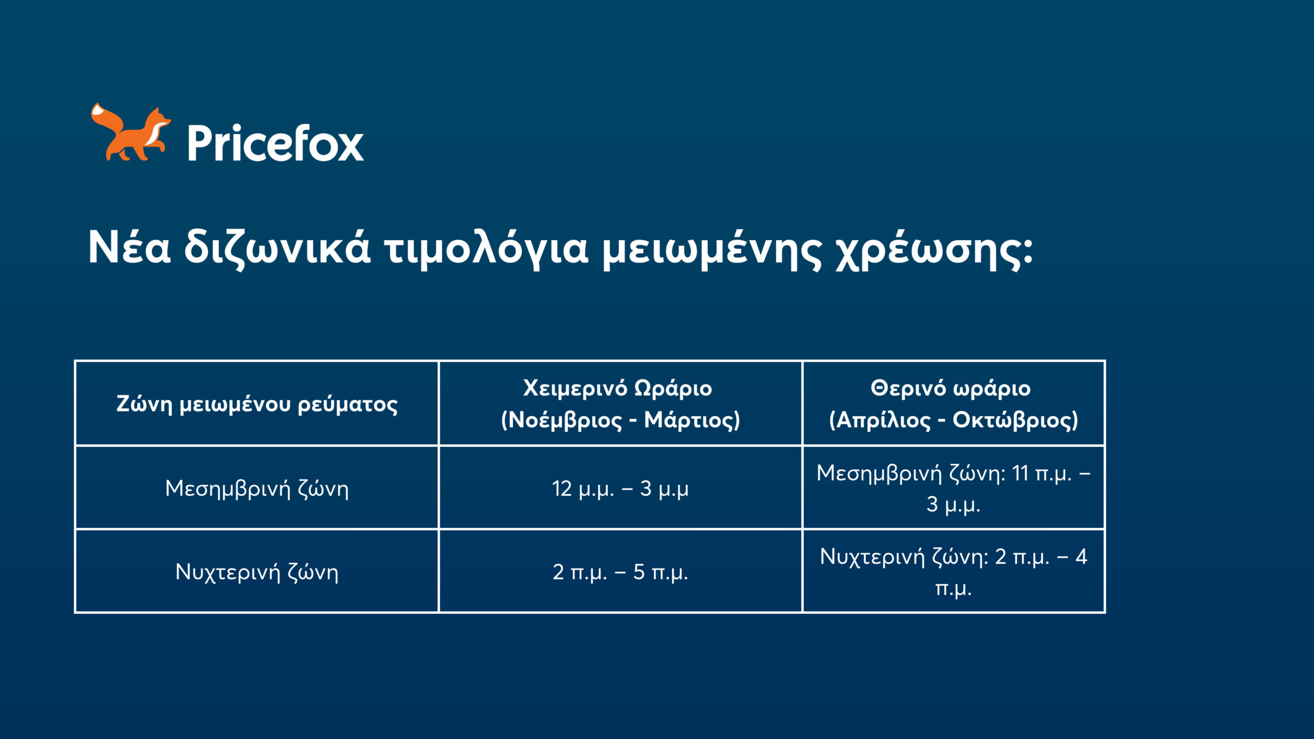 Θα υπάρχουν ουσιαστικά δύο ζώνες χρέωσης, μία μεσημβρινή και μία νυχτερινή, με διαφορετικές ώρες για το χειμερινό και το θερινό ωράριο:
