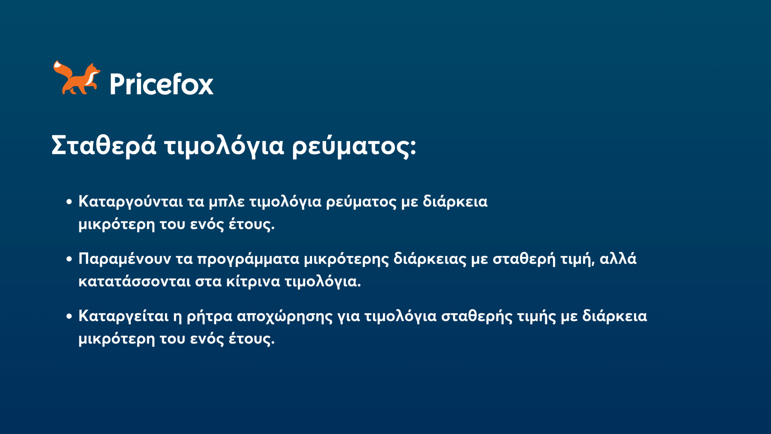 Οι πάροχοι θα μπορούν και μετά τις 17 Ιανουαρίου να διαθέτουν τιμολόγια με σταθερή χρέωση για λιγότερο από 12 μήνες. Ωστόσο, αυτά δεν θα μπορούν να χαρακτηρίζονται σταθερά και θα κατηγοριοποιούνται στα μεικτά τιμολόγια κίτρινου χρώματος.
