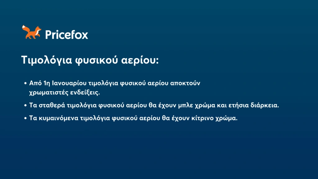 Η επιλογή των χρωμάτων ακολουθεί την ίδια λογική με τα τιμολόγια ρεύματος. Επομένως τα προγράμματα αερίου με σταθερή χρέωση θα έχουν μπλε χρώμα και τα προγράμματα κυμαινόμενης χρέωσης θα έχουν κίτρινο χρώμα.