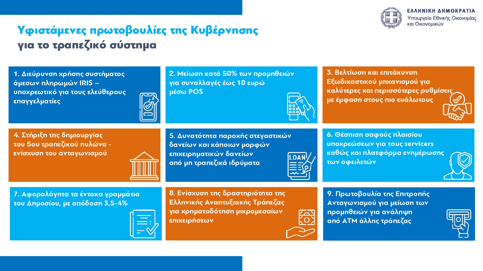 Τέλος, υπενθυμίζεται πως η Κυβέρνηση τα τελευταία χρόνια έχει προχωρήσει σε μια σειρά επιπλέον πρωτοβουλιών για το τραπεζικό σύστημα με θετικά αποτελέσματα τόσο στο πεδίο της μείωσης των προμηθειών όσο και σε εκείνο της ενίσχυσης του ανταγωνισμού. Συγκεκριμένα: