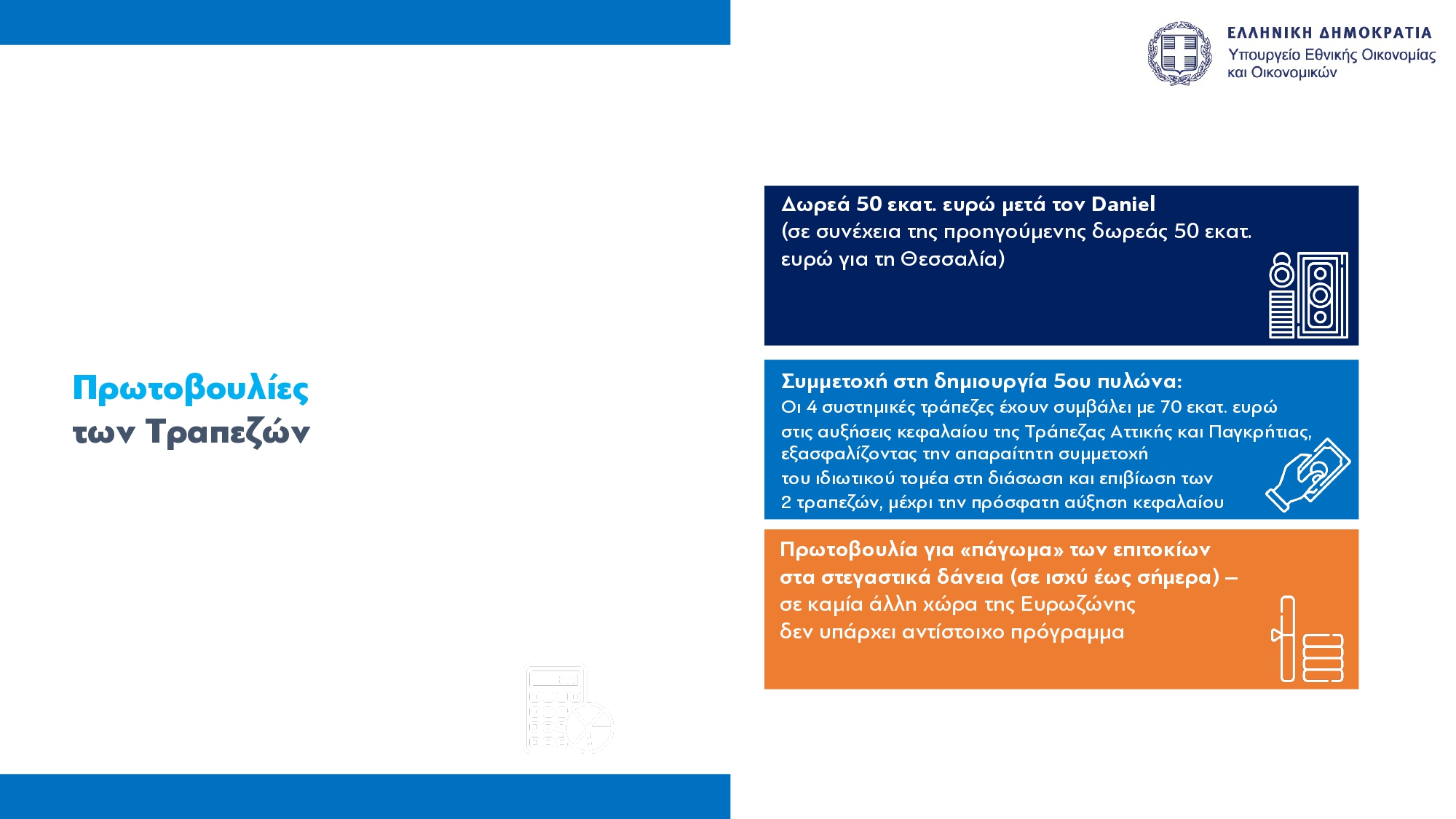 - Υπήρξε οικειοθελής στήριξη των πολιτών από τις τράπεζες μέσω της δωρεάς 50 εκατ. ευρώ μετά την καταστροφή που προκάλεσε ο Daniel, σε συνέχεια της προηγούμενης δωρεάς 50 εκατ. για την Θεσσαλία, ενώ συνεχίζεται και το «πάγωμα» των επιτοκίων στα στεγαστικά δάνεια.